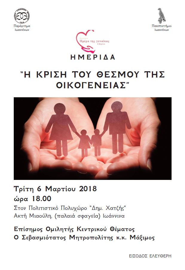 Το Παράρτημα Ιωαννίνων της Ε.Γ.Ε. σε συνδιοργάνωση με το Πανεπιστήμιο Ιωαννίνων διοργανώνουν Ημερίδα με θέμα: “Η ΚΡΙΣΗ ΤΟΥ ΘΕΣΜΟΥ ΤΗΣ ΟΙΚΟΓΕΝΕΙΑΣ” με επίσημο ομιλητή του Κεντρικού Θέματος τον Σεβασμιότατο Μητροπολίτη κ.κ. Μάξιμο. Η εκδήλωση θα πραγματοποιηθεί την Τρίτη 6 Μαρτίου 2018 και ώρα 18.00 στον Πολιτιστικό Πολυχώρο “Δημ. Χατζής” Ακτή Μιαούλη, (παλαιά σφαγεία) Ιωάννινα. …
