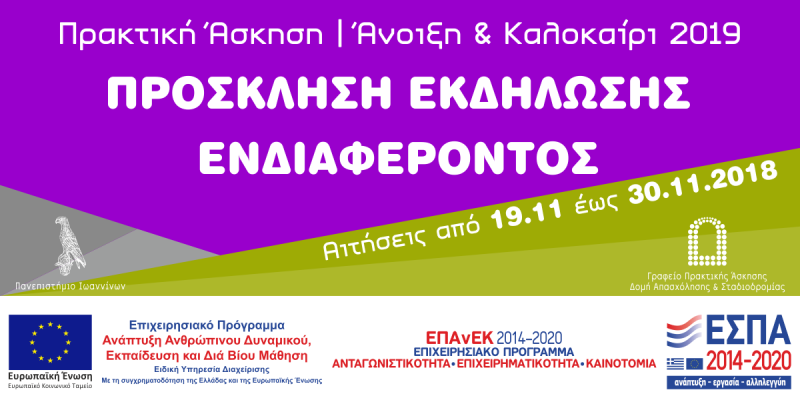 Πρόσκληση Εκδήλωσης Ενδιαφέροντος Φοιτητών για Πρακτική Άσκηση (Άνοιξη και Καλοκαίρι 2019)