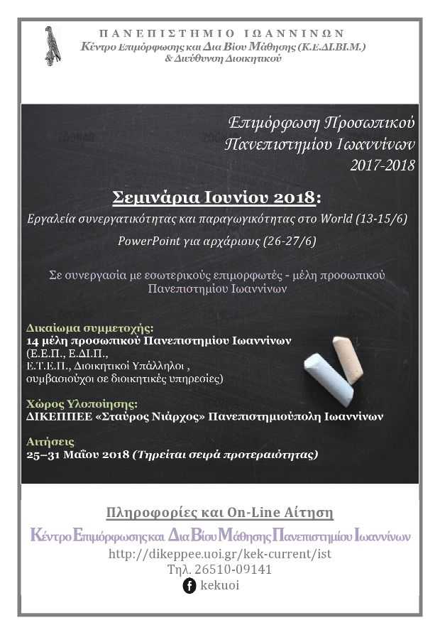 Από το 2014 το Κέντρο Επιμόρφωσης και Δια Βίου Μάθησης (Κ.Ε.ΔΙ.ΒΙ.Μ.) και η Διεύθυνση Διοικητικού του Πανεπιστημίου Ιωαννίνων υλοποιούν δράσεις επιμόρφωσης για το προσωπικό του Πανεπιστημίου μας. Στο πλαίσιο αυτό, υλοποιούνται, μεταξύ άλλων, επιμορφωτικά σεμινάρια σε συνεργασία με εσωτερικούς επιμορφωτές-μέλη προσωπικού του Πανεπιστημίου μας. Τον Ιούνιο 2018, πρόκειται να υλοποιηθούν τα παρακάτω δύο νέα εσωτερικά…