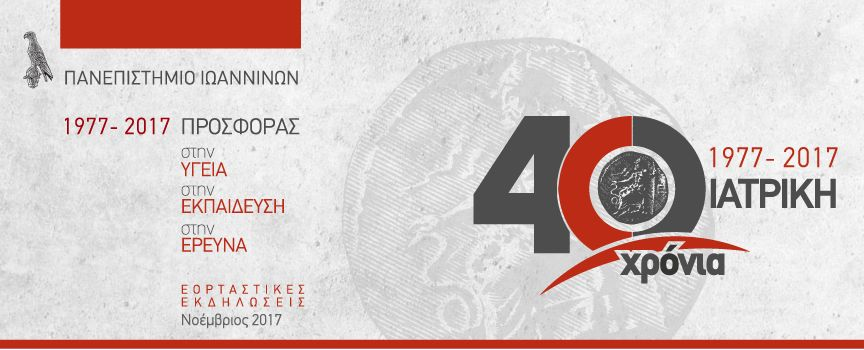 Το Τμήμα Ιατρικής της Σχολής Επιστημών Υγείας του Πανεπιστημίου Ιωαννίνων διοργανώνει μια σειρά εκδηλώσεων με αφορμή τον εορτασμό των 40 ετών από την ίδρυσή του που θα πραγματοποιηθούν στις 22, 24-26 Νοεμβρίου 2017.