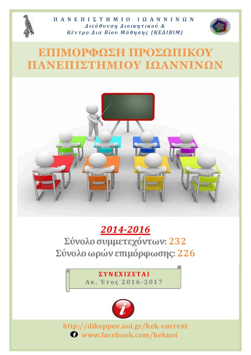 Από το 2014 μέχρι σήμερα, έχουν πραγματοποιηθεί 226 ώρες επιμόρφωσης, τις οποίες παρακολούθησαν 232 μέλη προσωπικού του Πανεπιστημίου Ιωαννίνων. Τα αντικείμενα εκπαίδευσης καλύπτουν μία ευρεία γκάμα αντικειμένων, όπως διοίκηση δημόσιου τομέα, δεξιότητες τεχνολογιών πληροφορικής, δεξιότητες επικοινωνίας-συνεργασίας και πρώτες βοήθειες. Η εκπαίδευση πραγματοποιείται στο Πανεπιστήμιο Ιωαννίνων, στις αίθουσες του ΔΙΚΕΠΠΕΕ «Σταύρος Νιάρχος». Οι δράσεις επιμόρφωσης συνεχίζονται και το ακαδημαϊκό έτος 2016-2017.