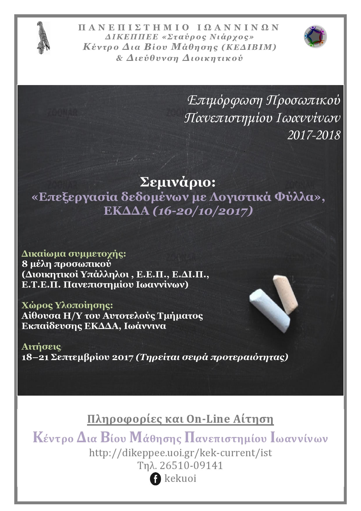 Μετά από σχετικό έγγραφο αίτημα του ΚΕΔΙΒΙΜ και της Διεύθυνσης Διοικητικού προς το Εθνικό Κέντρο Δημόσιας Διοίκησης και Αυτοδιοίκησης (ΕΚΔΔΑ), πρόκειται να υλοποιηθεί πιστοποιημένο πρόγραμμα επιμόρφωσης, με τίτλο «Επεξεργασία Δεδομένων με Λογιστικά Φύλλα», από 16 έως και 20 Οκτωβρίου 2017, (8.00π.μ. – 15.00μ.μ.). Δικαίωμα συμμετοχής έχουν: Διοικητικοί Υπάλληλοι, Ε.Ε.Π., Ε.ΔΙ.Π., & Ε.Τ.Ε.Π. του Πανεπιστημίου Ιωαννίνων. Ο μέγιστος αριθμός συμμετεχόντων είναι 8 άτομα.