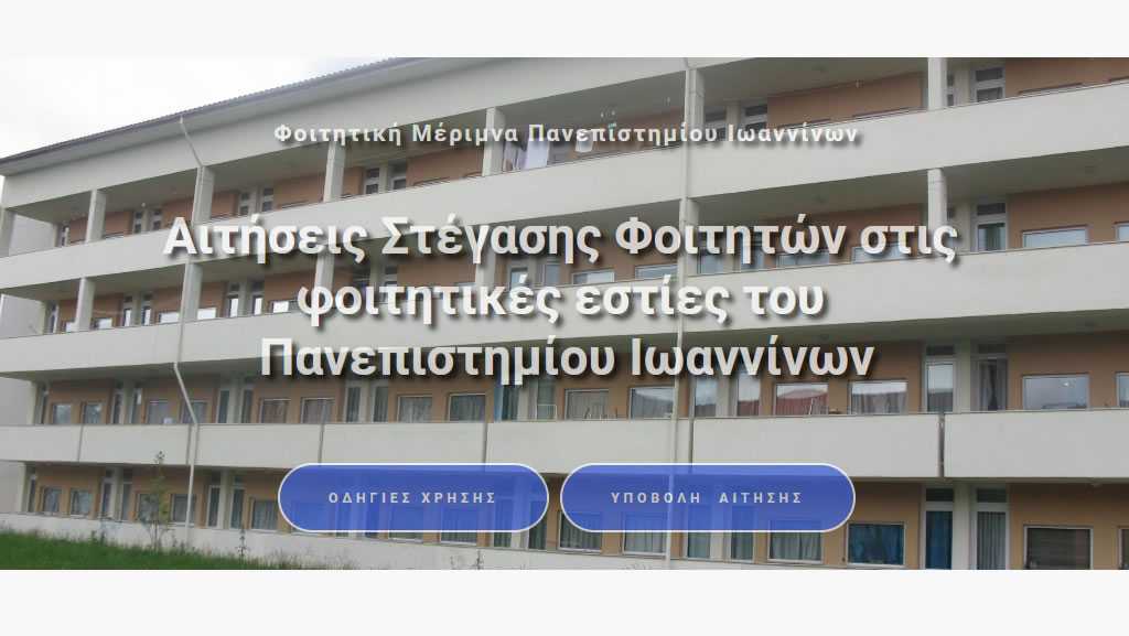 Οι ηλεκτρονικές αιτήσεις που αφορούν την παροχή στέγασης στις Φοιτητικές Κατοικίες του Πανεπιστημίου Ιωαννίνων για το ακαδημαϊκό έτος 2021-2022 των παραπάνω κατηγοριών, θα υποβάλλονται από την Δευτέρα 17 Ιανουαρίου έως και την Δευτέρα 31 Ιανουαρίου 2022, μέσω της ιστοσελίδας του Πανεπιστημίου Ιωαννίνων, στην ειδική εφαρμογή για την στέγαση στον σύνδεσμο: